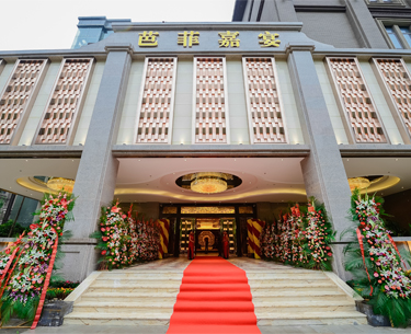 芭菲婚宴重庆九龙滨江店位于九龙坡区九滨路九龙滨江芭菲嘉宴,总建筑面积约18000平方米,分别经营零点中餐、品质宴会;共设零点中餐豪华包房29个,中餐大厅一个,豪华宴会厅6个宴会中心拥有宴会厅六个,一号宴会厅可接待46桌以内各类型宴会;二号宴会厅可接待40桌以内各类型宴会;三号宴会厅可接待46桌以内各类型宴会;五号宴会厅可接待30桌以内各类型宴会;六号宴会厅可接待29桌以内各类型宴会;八号宴会厅可接待54桌以内各类型宴会。负二楼地下停车场可泊车位1000个,宾客由停车库直接乘芭菲客用电梯)到达各楼层消费区。